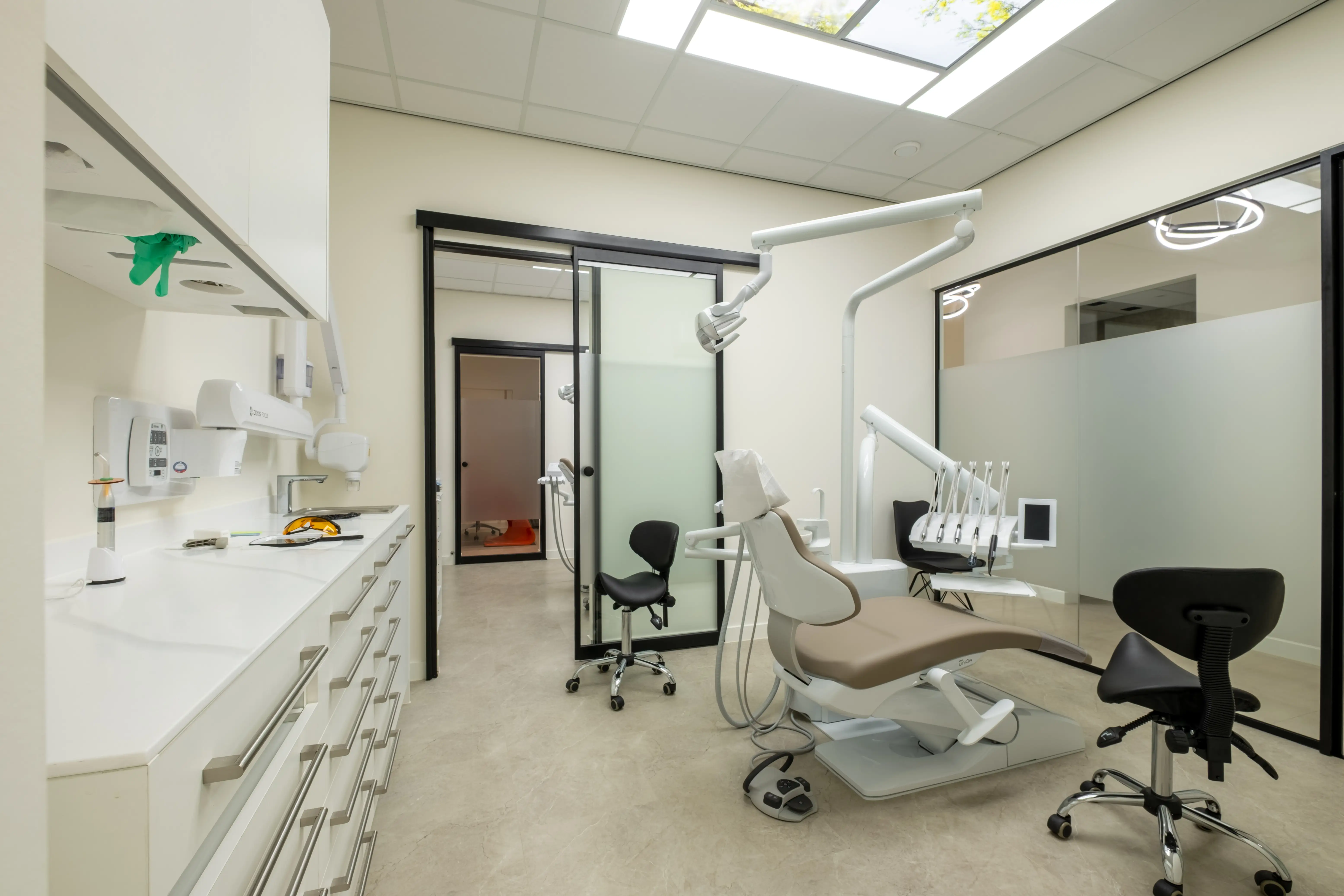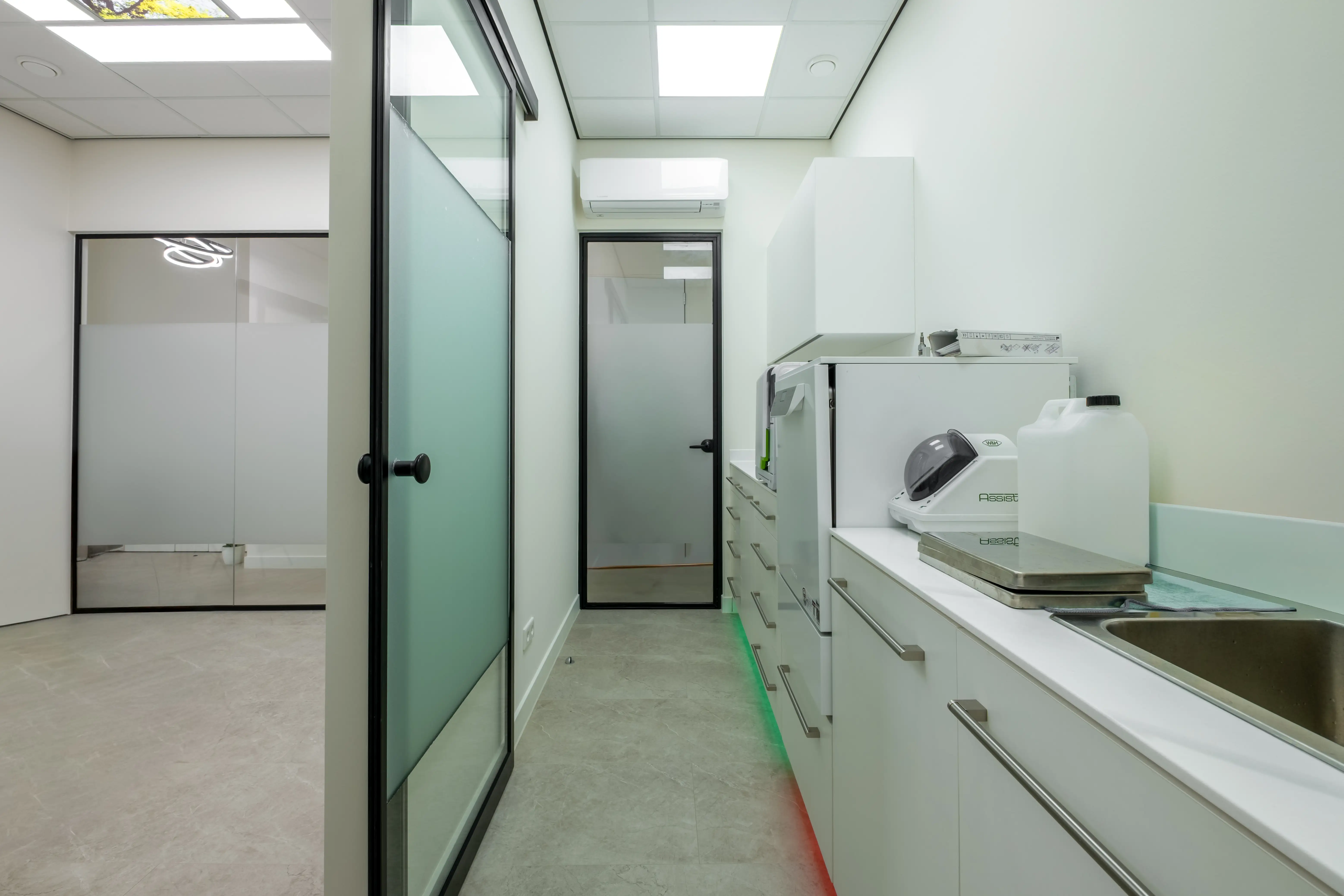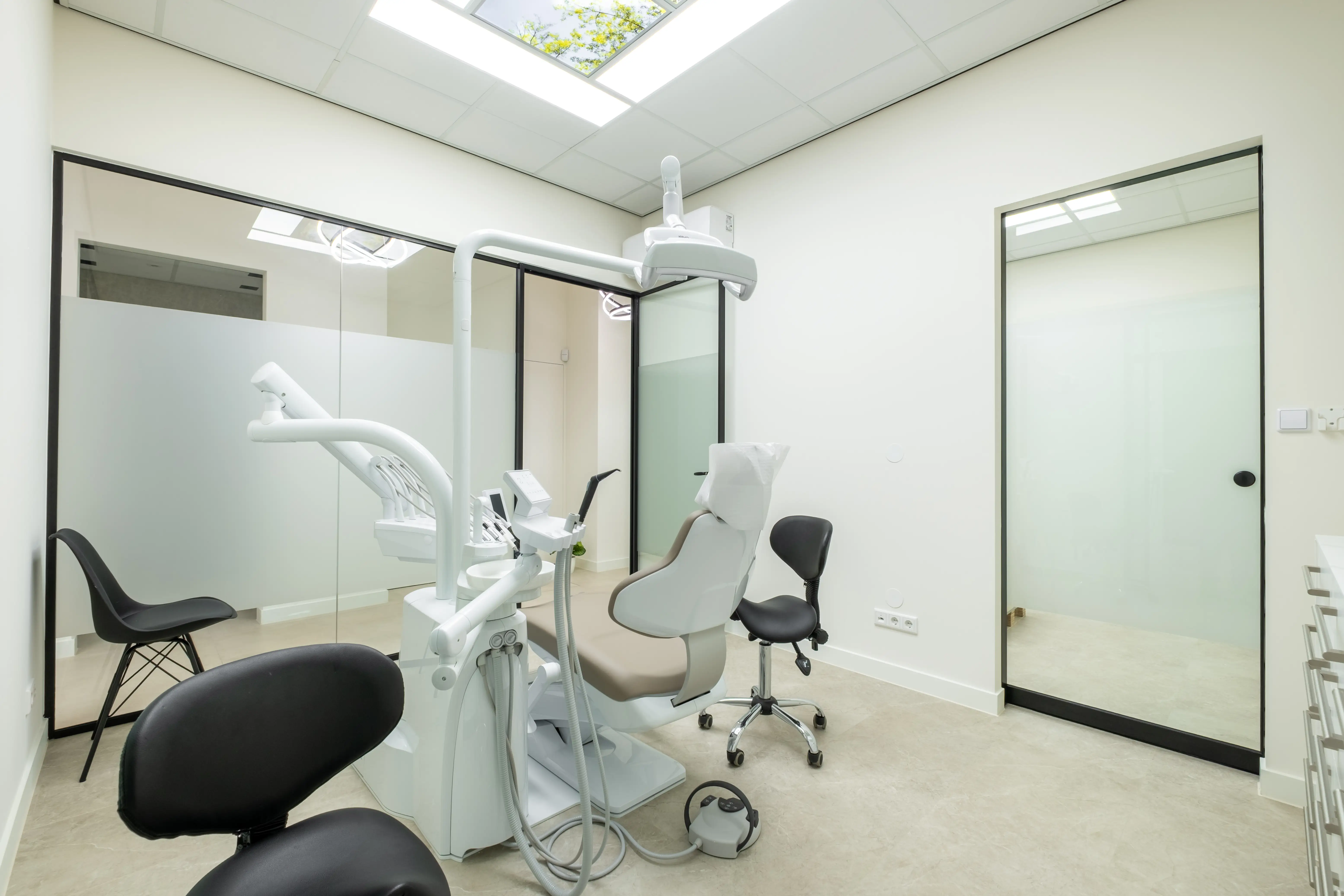 Glazen deuren, behandelkamers en wachtruimte met speciaal ontworpen meubels.